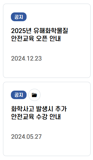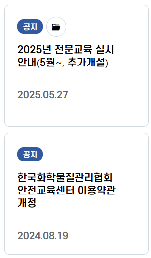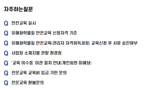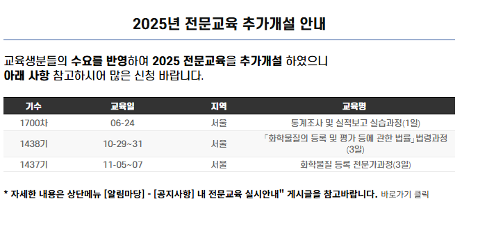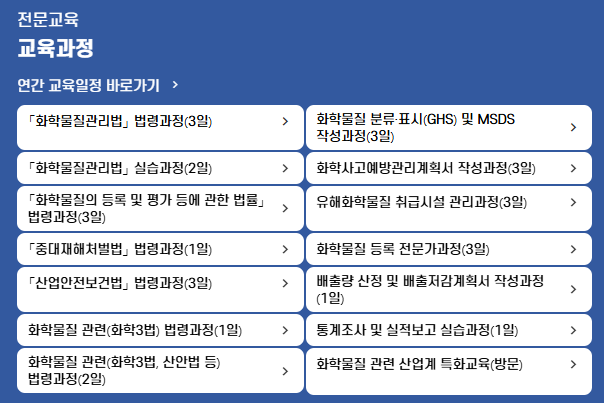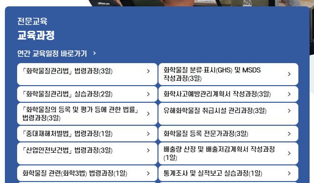 ➡ 위 모든 교육은 유해화학물질 안전교육센터 홈페이지에서 확인 및 신청 가능하며, 과정별 안내 및 자료도 상세히 제공됩니다.