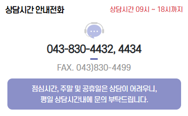 상담시간 안내전화 상담시간 09시 ~ 18시까지 점심시간, 주말 및 공휴일은 상담이 어려우니, 평일 상담시간내에 문의 부탁드립니다.
