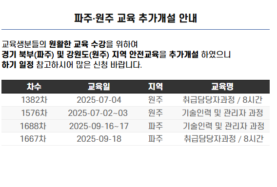 - 신규교육 / 보수교육 / 심화교육 등 유형별로 분류
