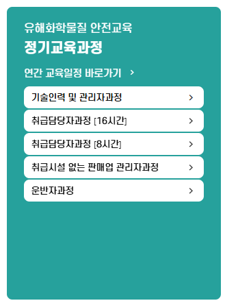 유해화학물질 안전교육 정기교육과정 연간 교육일정 바로가기 유해화학물질 관리자(책임자, 점검원) 유해화학물질 영업자(또는 수급인)가 고용한 자 유해화학물질 영업자가 고용한 자 중 유해