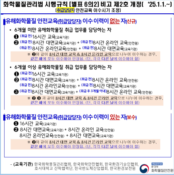 - 교육은 반드시 유해화학물질 안전교육센터 등 공식 기관을 통해 이수해야 효과 인정
