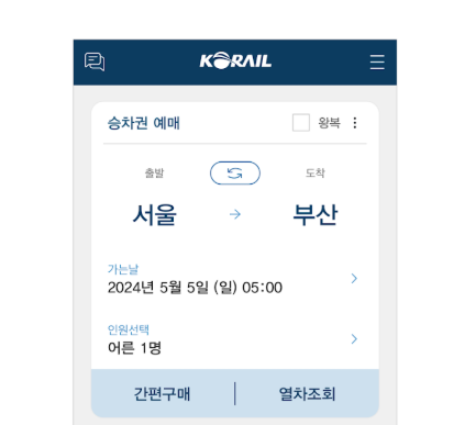 레츠코레일 홈페이지의 '왕복 예약' 기능을 활용해 귀향편 먼저 지정 후 출발편 선택