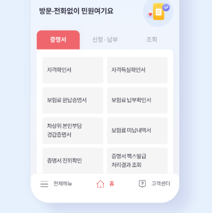 The건강보험 서비스는 공단 홈페이지내의 주요 콘텐츠를 국민들이 모바일에서 쉽고 빠르게 많은 정보를 접할 수 있도록 구성하였습니다.