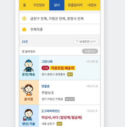 타 플랫폼보다 소규모 업체 채용, 단기직, 즉시 채용 공고가 훨씬 빠르게 올라옵니다.
